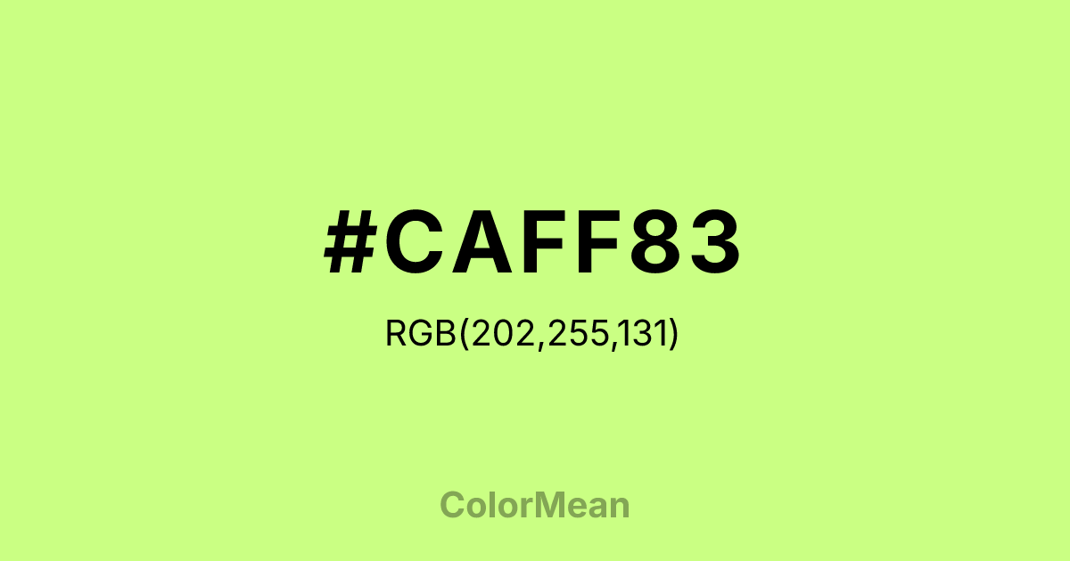 #CAFF83 RGB value is (202, 255, 131). The hex color red value is 202, green is 255, and blue is 131. Its HSL format shows a hue of 86°, saturation of 100 percent, and lightness of 76 percent. The CMYK process values are 21 percent, 0 percent, 49 percent, 0 percent.