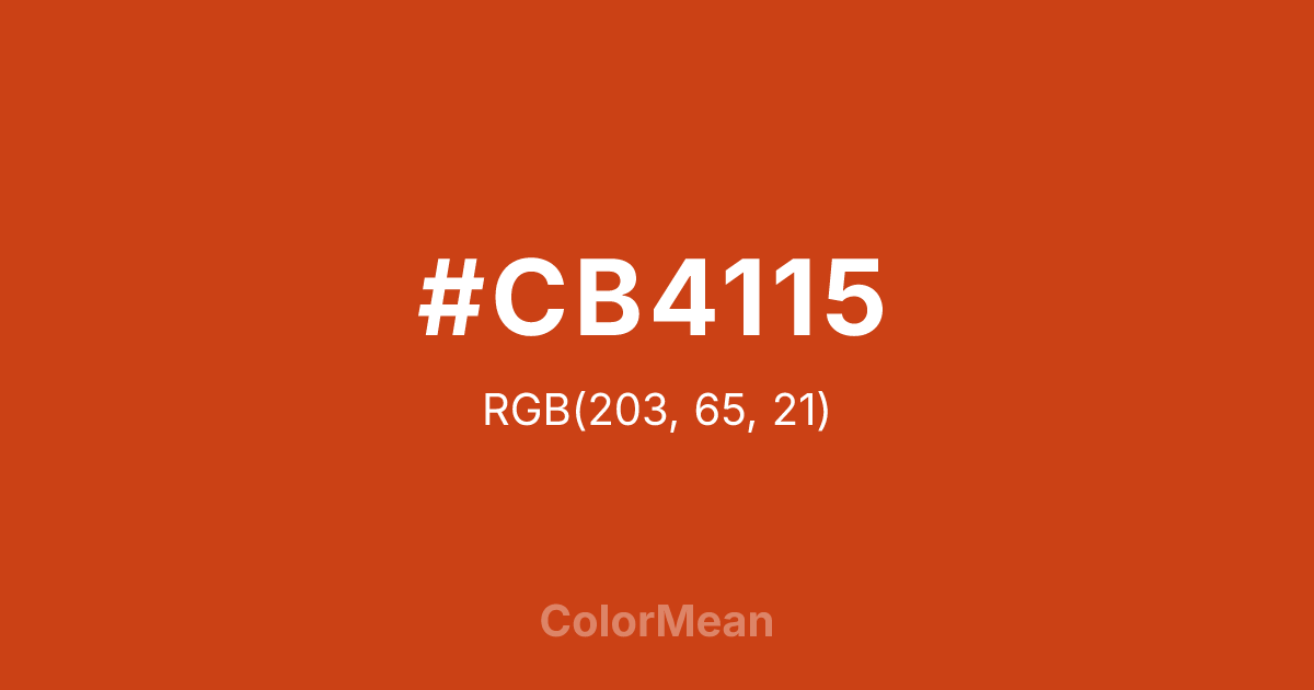 #CB4115 RGB value is (203, 65, 21). The hex color red value is 203, green is 65, and blue is 21. Its HSL format shows a hue of 15°, saturation of 81 percent, and lightness of 44 percent. The CMYK process values are 0 percent, 68 percent, 90 percent, 20 percent.