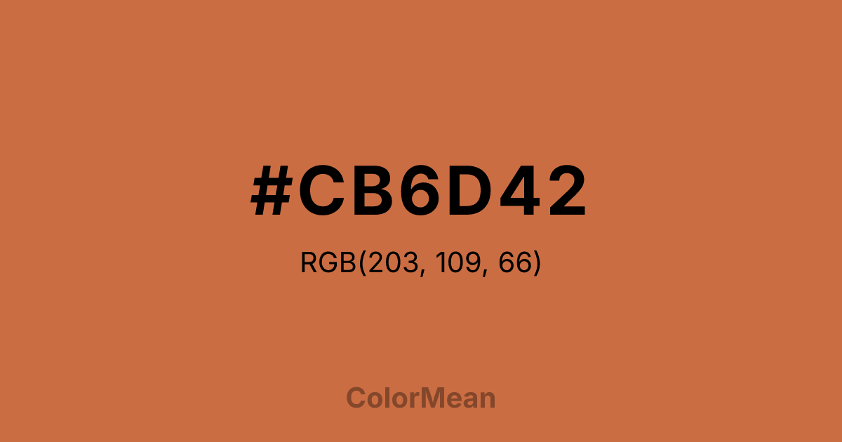 #CB6D42 RGB value is (203, 109, 66). The hex color red value is 203, green is 109, and blue is 66. Its HSL format shows a hue of 19°, saturation of 57 percent, and lightness of 53 percent. The CMYK process values are 0 percent, 46 percent, 67 percent, 20 percent.