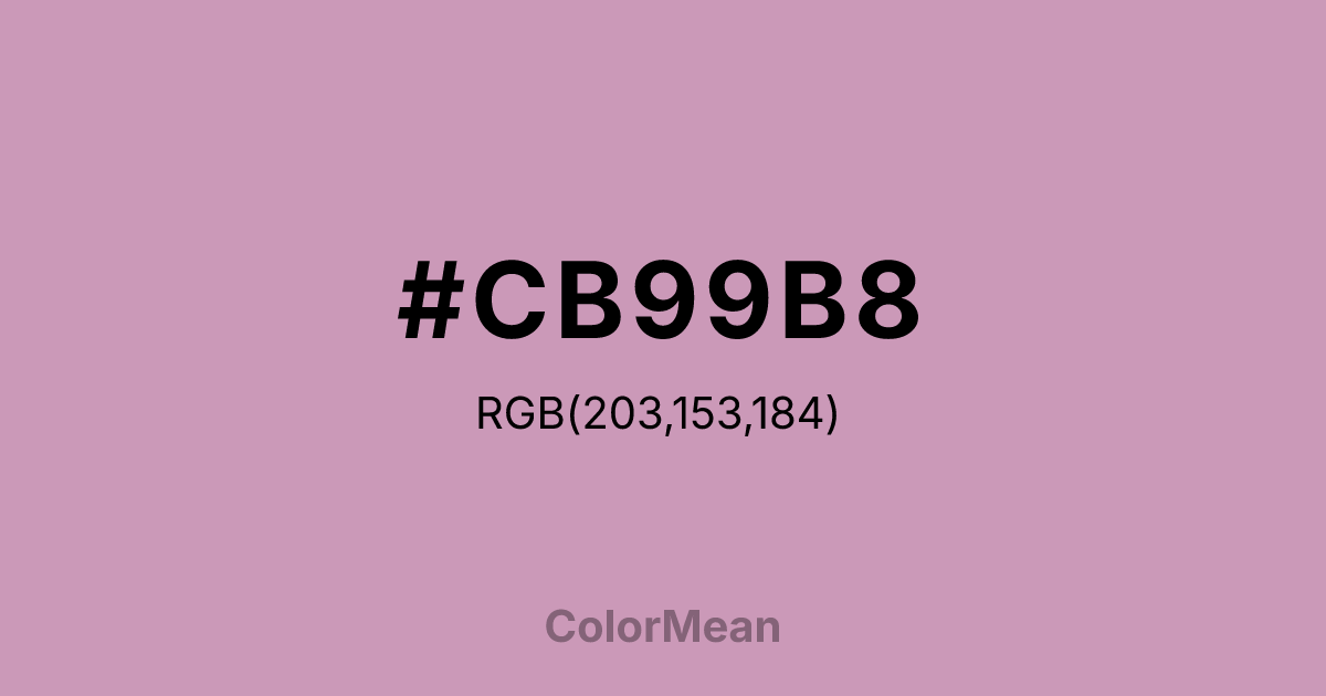 #CB99B8 RGB value is (203, 153, 184). The hex color red value is 203, green is 153, and blue is 184. Its HSL format shows a hue of 323°, saturation of 32 percent, and lightness of 70 percent. The CMYK process values are 0 percent, 25 percent, 9 percent, 20 percent.