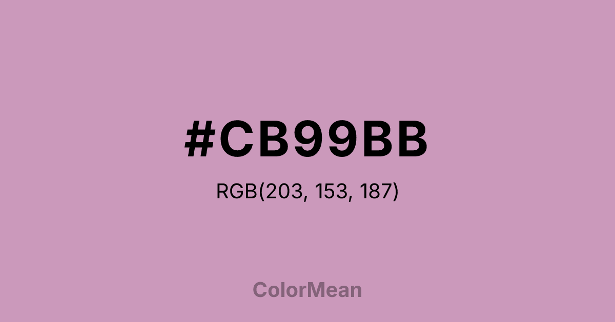 #CB99BB RGB value is (203, 153, 187). The hex color red value is 203, green is 153, and blue is 187. Its HSL format shows a hue of 319°, saturation of 32 percent, and lightness of 70 percent. The CMYK process values are 0 percent, 25 percent, 8 percent, 20 percent.