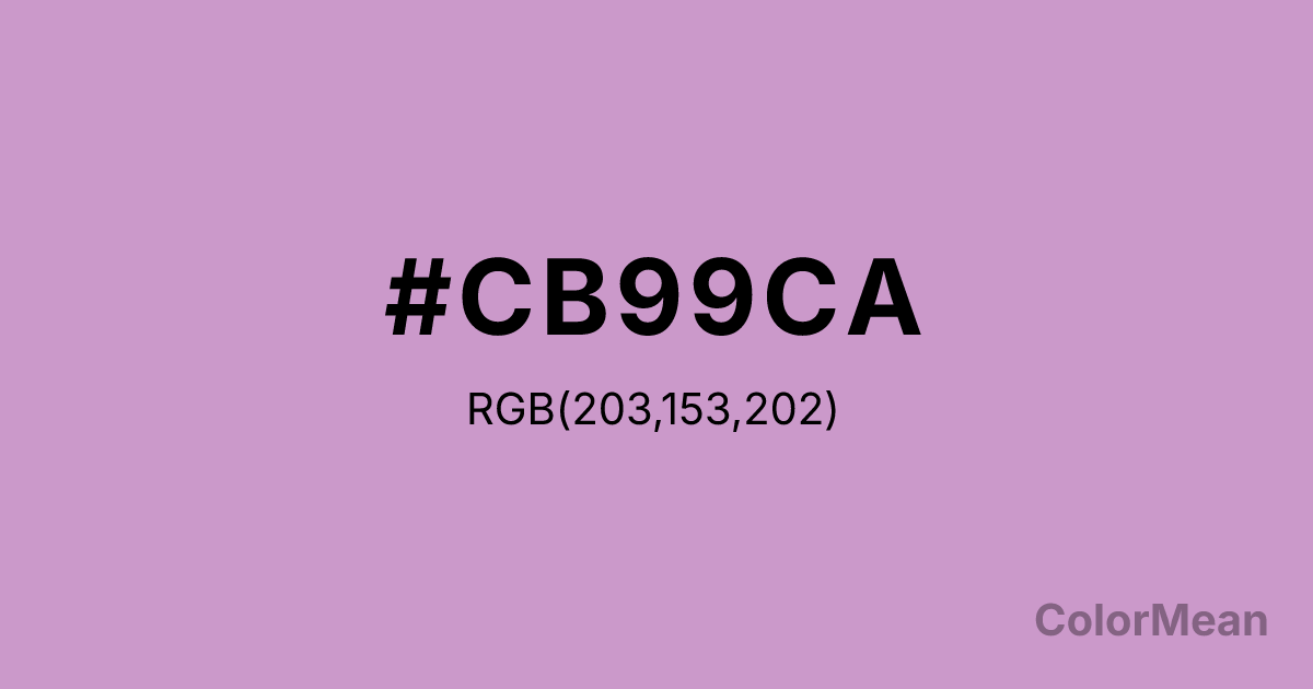 #CB99CA RGB value is (203, 153, 202). The hex color red value is 203, green is 153, and blue is 202. Its HSL format shows a hue of 301°, saturation of 32 percent, and lightness of 70 percent. The CMYK process values are 0 percent, 25 percent, 0 percent, 20 percent.