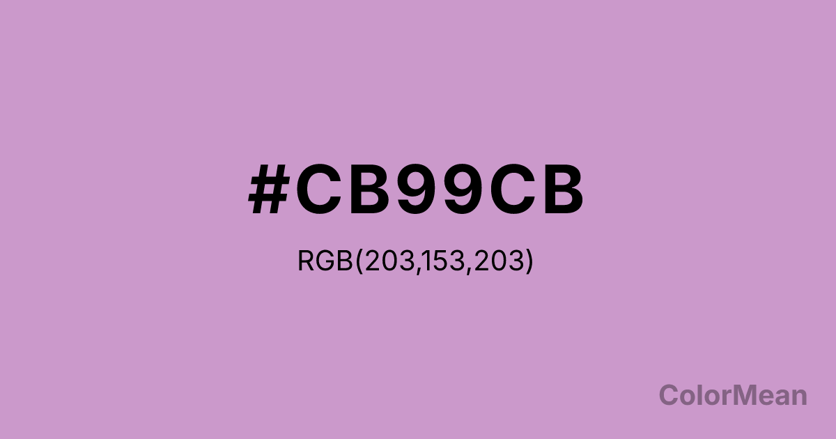 #CB99CB RGB value is (203, 153, 203). The hex color red value is 203, green is 153, and blue is 203. Its HSL format shows a hue of 300°, saturation of 32 percent, and lightness of 70 percent. The CMYK process values are 0 percent, 25 percent, 0 percent, 20 percent.