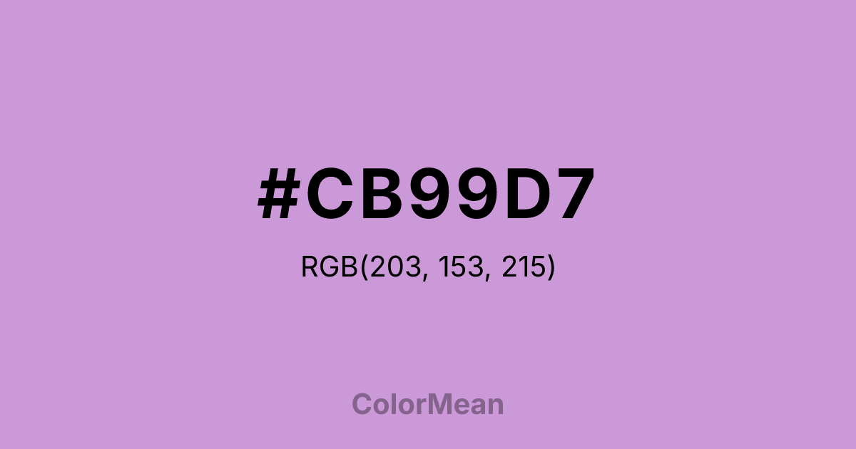 #CB99D7 RGB value is (203, 153, 215). The hex color red value is 203, green is 153, and blue is 215. Its HSL format shows a hue of 288°, saturation of 44 percent, and lightness of 72 percent. The CMYK process values are 6 percent, 29 percent, 0 percent, 16 percent.