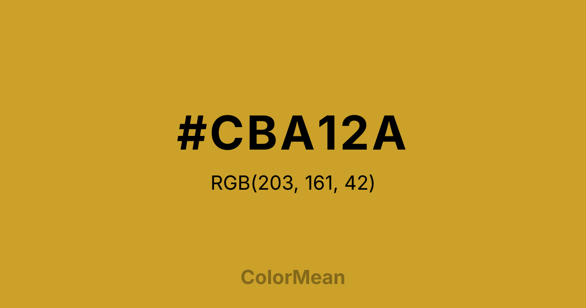 #CBA12A RGB value is (203, 161, 42). The hex color red value is 203, green is 161, and blue is 42. Its HSL format shows a hue of 44°, saturation of 66 percent, and lightness of 48 percent. The CMYK process values are 0 percent, 21 percent, 79 percent, 20 percent.