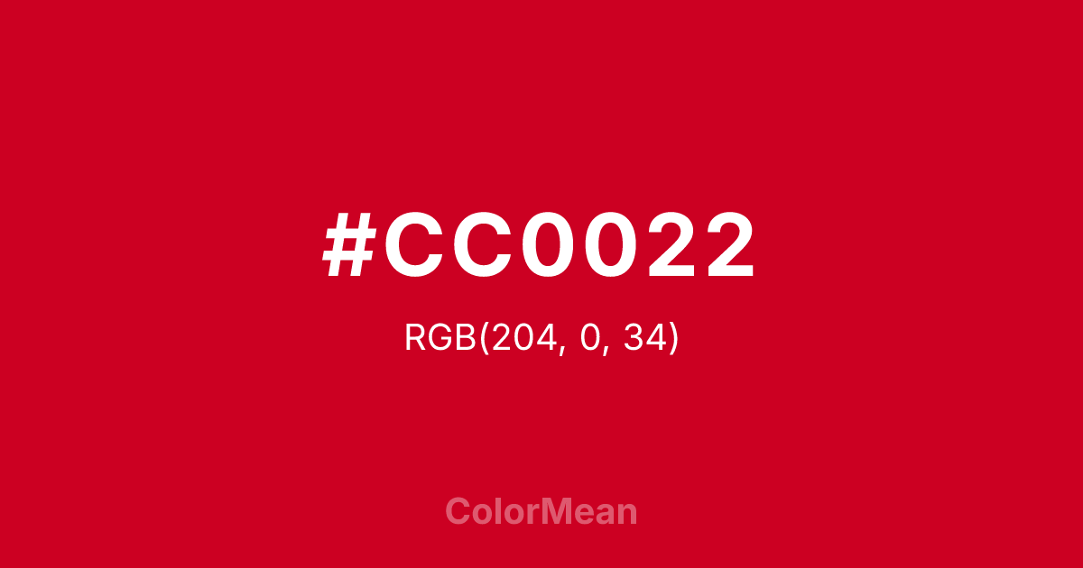 #CC0022 RGB value is (204, 0, 34). The hex color red value is 204, green is 0, and blue is 34. Its HSL format shows a hue of 350°, saturation of 100 percent, and lightness of 40 percent. The CMYK process values are 0 percent, 100 percent, 83 percent, 20 percent.