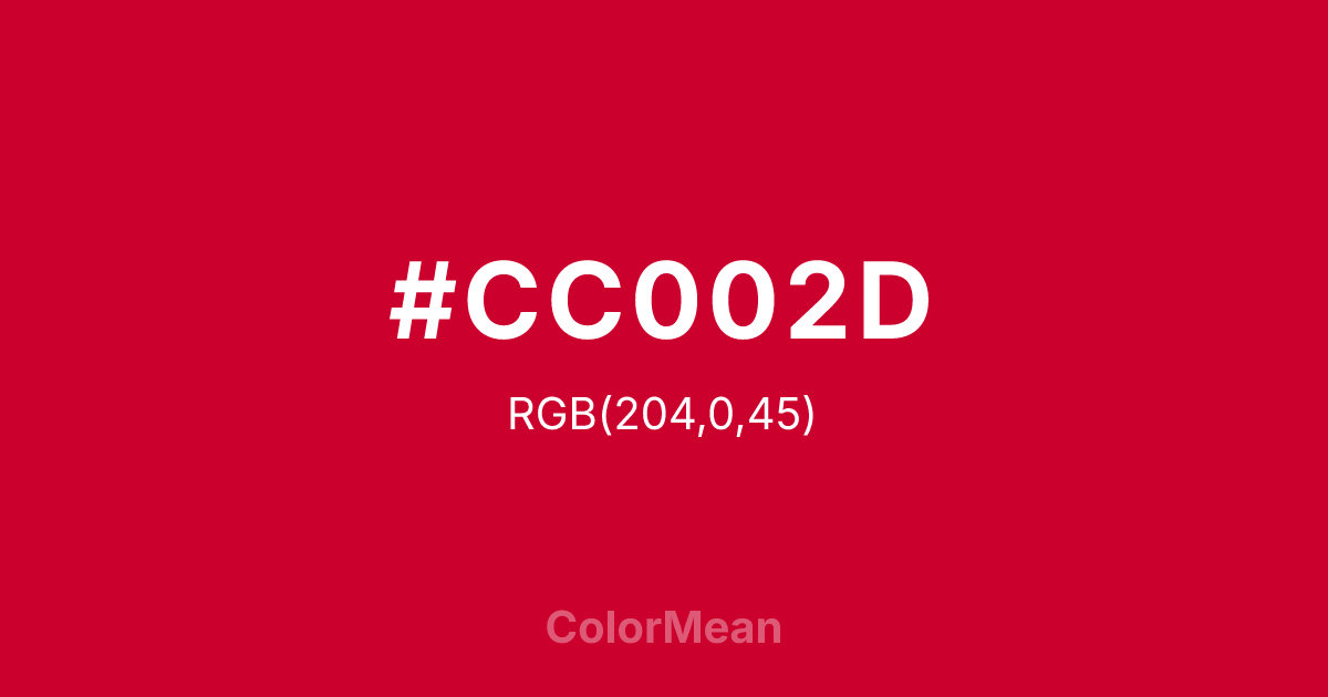 #CC002D RGB value is (204, 0, 45). The hex color red value is 204, green is 0, and blue is 45. Its HSL format shows a hue of 347°, saturation of 100 percent, and lightness of 40 percent. The CMYK process values are 0 percent, 100 percent, 78 percent, 20 percent.