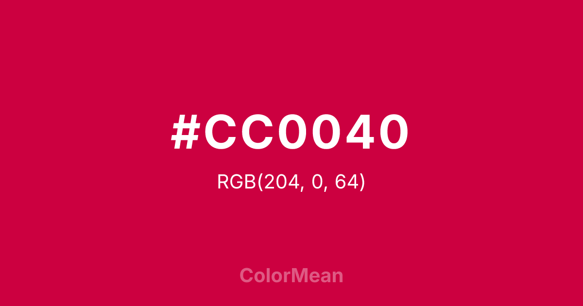 #CC0040 RGB value is (204, 0, 64). The hex color red value is 204, green is 0, and blue is 64. Its HSL format shows a hue of 341°, saturation of 100 percent, and lightness of 40 percent. The CMYK process values are 0 percent, 100 percent, 69 percent, 20 percent.
