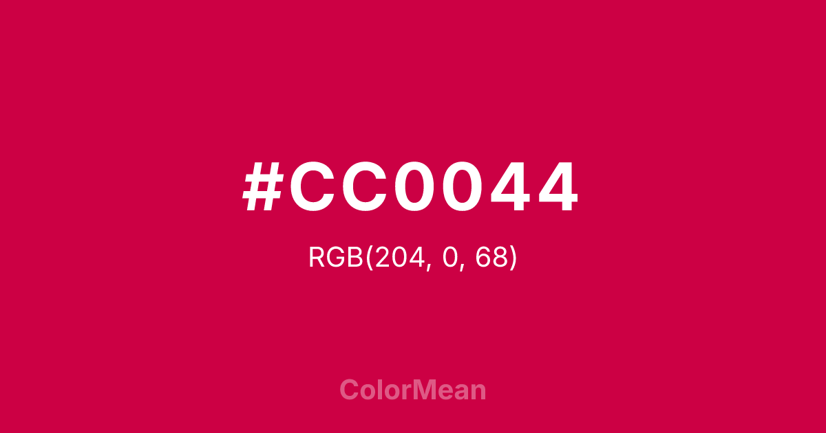 #CC0044 RGB value is (204, 0, 68). The hex color red value is 204, green is 0, and blue is 68. Its HSL format shows a hue of 340°, saturation of 100 percent, and lightness of 40 percent. The CMYK process values are 0 percent, 100 percent, 67 percent, 20 percent.
