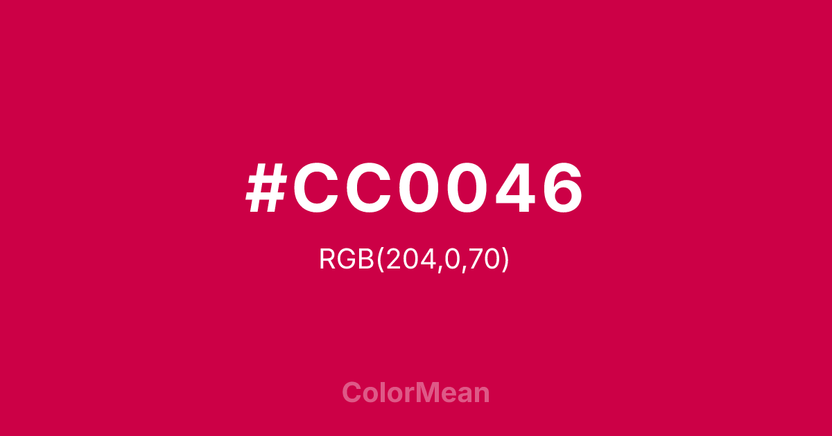 #CC0046 RGB value is (204, 0, 70). The hex color red value is 204, green is 0, and blue is 70. Its HSL format shows a hue of 339°, saturation of 100 percent, and lightness of 40 percent. The CMYK process values are 0 percent, 100 percent, 66 percent, 20 percent.