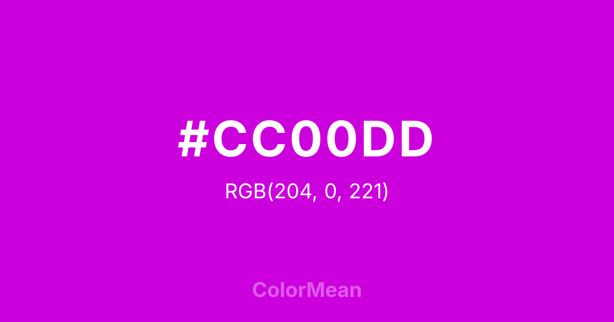 #CC00DD RGB value is (204, 0, 221). The hex color red value is 204, green is 0, and blue is 221. Its HSL format shows a hue of 295°, saturation of 100 percent, and lightness of 43 percent. The CMYK process values are 8 percent, 100 percent, 0 percent, 13 percent.