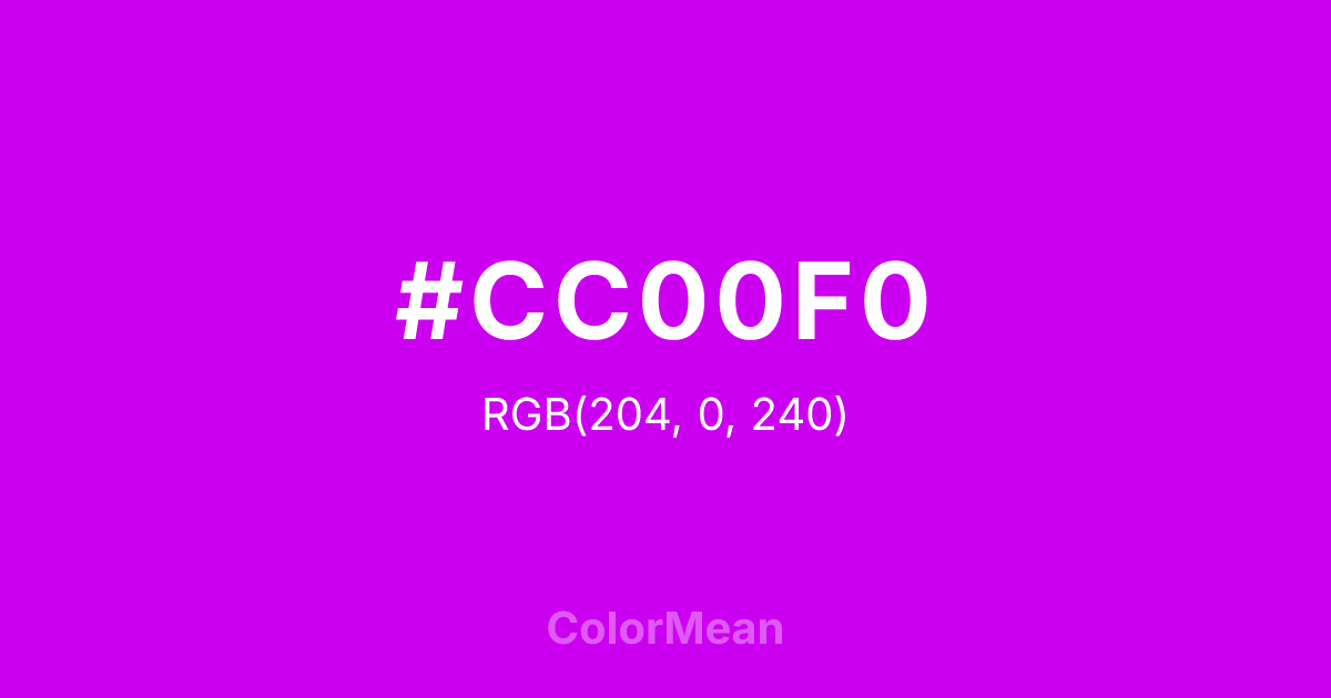 #CC00F0 RGB value is (204, 0, 240). The hex color red value is 204, green is 0, and blue is 240. Its HSL format shows a hue of 291°, saturation of 100 percent, and lightness of 47 percent. The CMYK process values are 15 percent, 100 percent, 0 percent, 6 percent.