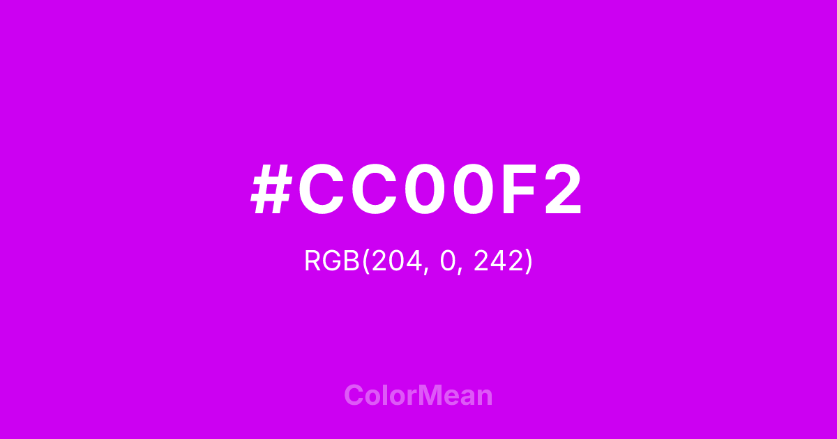 #CC00F2 RGB value is (204, 0, 242). The hex color red value is 204, green is 0, and blue is 242. Its HSL format shows a hue of 291°, saturation of 100 percent, and lightness of 47 percent. The CMYK process values are 16 percent, 100 percent, 0 percent, 5 percent.