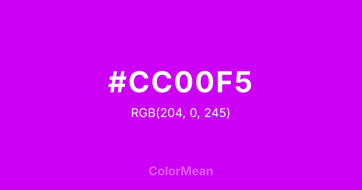 #CC00F5 RGB value is (204, 0, 245). The hex color red value is 204, green is 0, and blue is 245. Its HSL format shows a hue of 290°, saturation of 100 percent, and lightness of 48 percent. The CMYK process values are 17 percent, 100 percent, 0 percent, 4 percent.