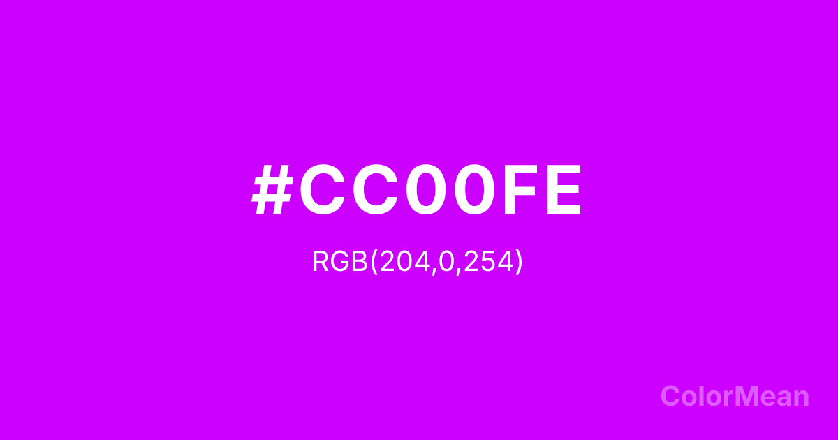 #CC00FE RGB value is (204, 0, 254). The hex color red value is 204, green is 0, and blue is 254. Its HSL format shows a hue of 288°, saturation of 100 percent, and lightness of 50 percent. The CMYK process values are 20 percent, 100 percent, 0 percent, 0 percent.