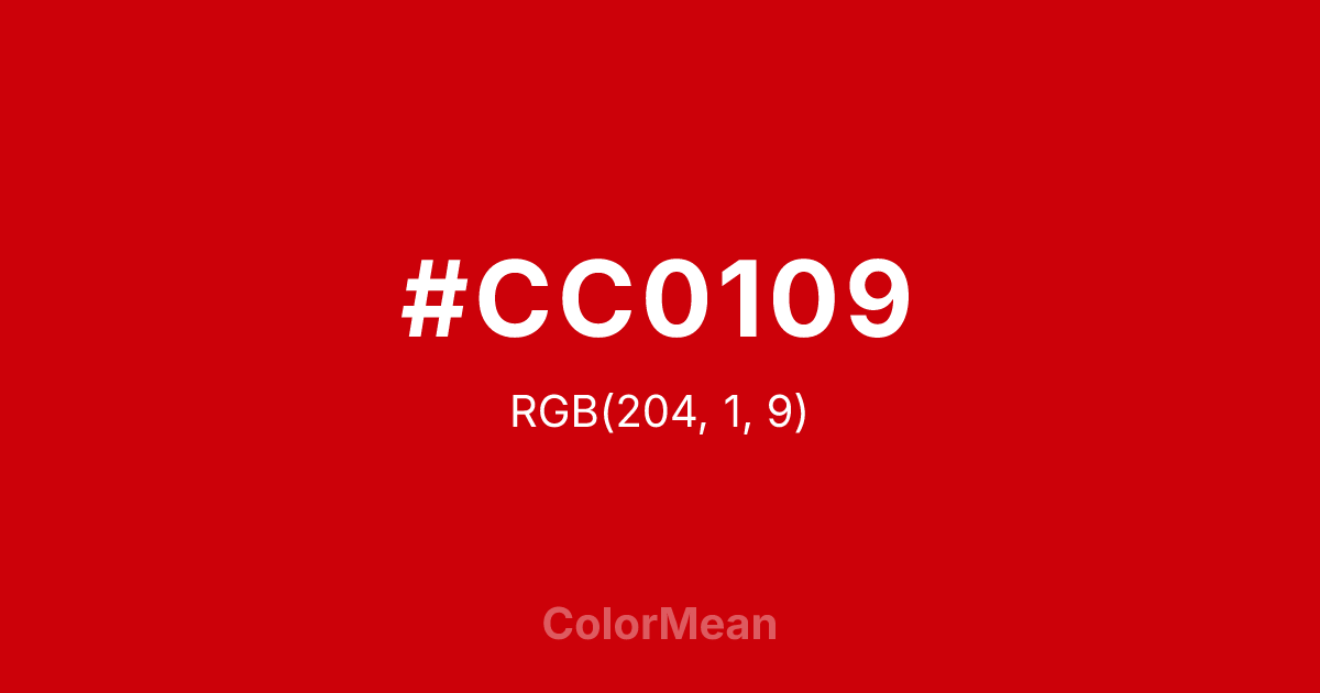 #CC0109 RGB value is (204, 1, 9). The hex color red value is 204, green is 1, and blue is 9. Its HSL format shows a hue of 358°, saturation of 99 percent, and lightness of 40 percent. The CMYK process values are 0 percent, 100 percent, 96 percent, 20 percent.