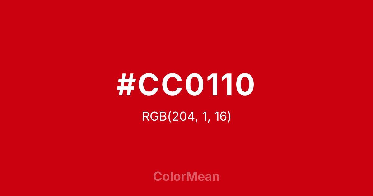 #CC0110 RGB value is (204, 1, 16). The hex color red value is 204, green is 1, and blue is 16. Its HSL format shows a hue of 356°, saturation of 99 percent, and lightness of 40 percent. The CMYK process values are 0 percent, 100 percent, 92 percent, 20 percent.