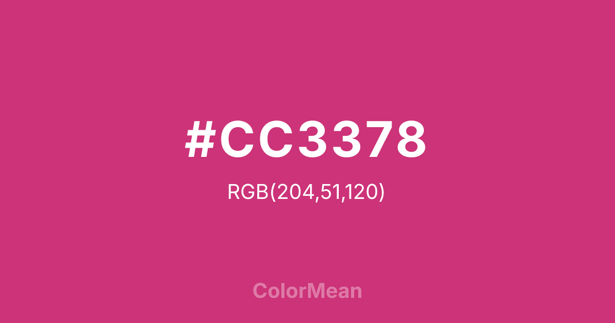#CC3378 RGB value is (204, 51, 120). The hex color red value is 204, green is 51, and blue is 120. Its HSL format shows a hue of 333°, saturation of 60 percent, and lightness of 50 percent. The CMYK process values are 0 percent, 75 percent, 41 percent, 20 percent.
