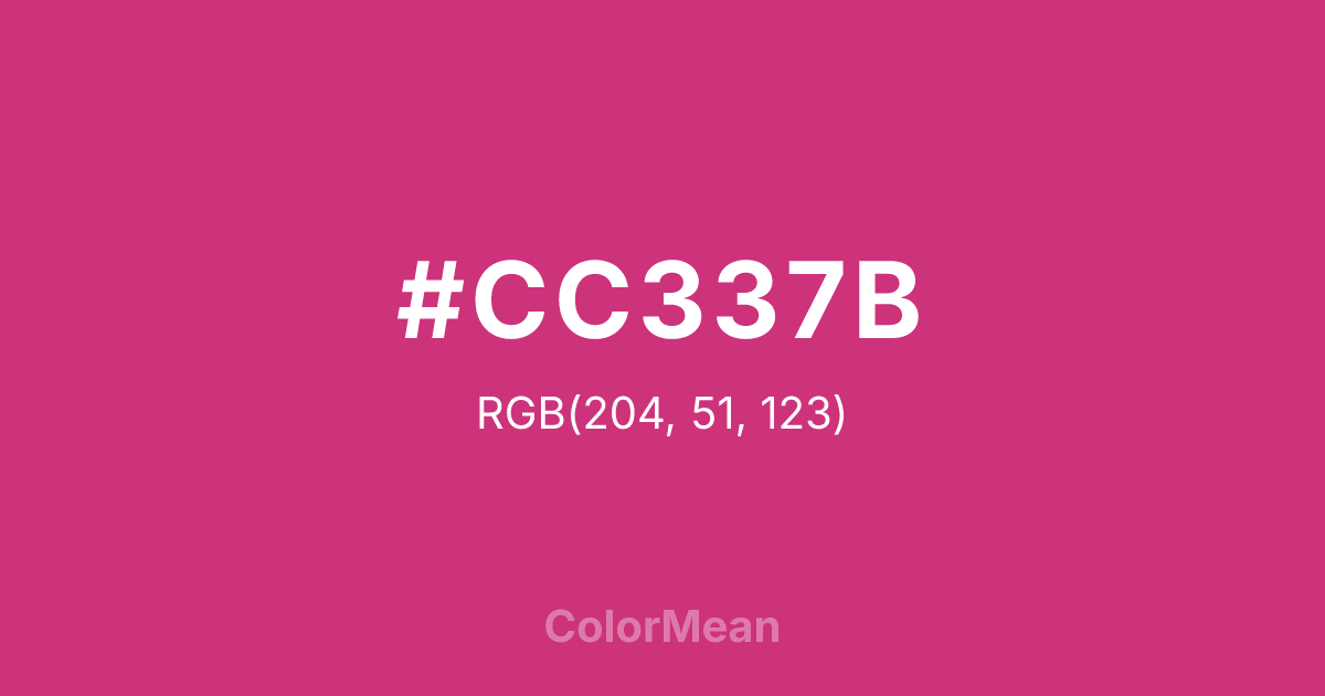 #CC337B RGB value is (204, 51, 123). The hex color red value is 204, green is 51, and blue is 123. Its HSL format shows a hue of 332°, saturation of 60 percent, and lightness of 50 percent. The CMYK process values are 0 percent, 75 percent, 40 percent, 20 percent.