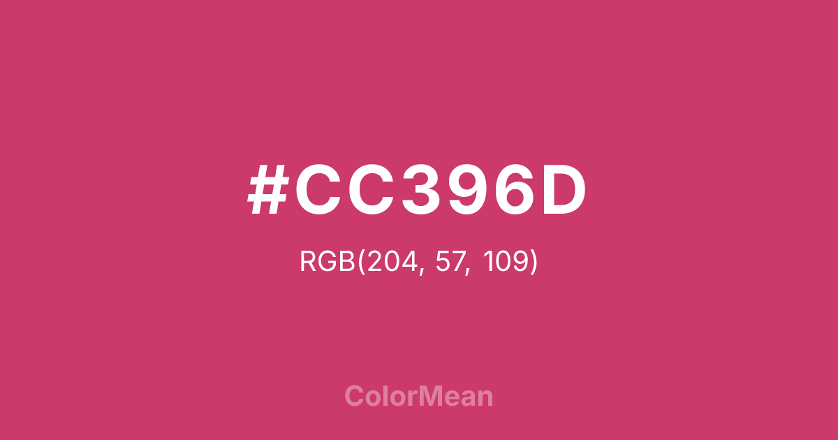 #CC396D RGB value is (204, 57, 109). The hex color red value is 204, green is 57, and blue is 109. Its HSL format shows a hue of 339°, saturation of 59 percent, and lightness of 51 percent. The CMYK process values are 0 percent, 72 percent, 47 percent, 20 percent.