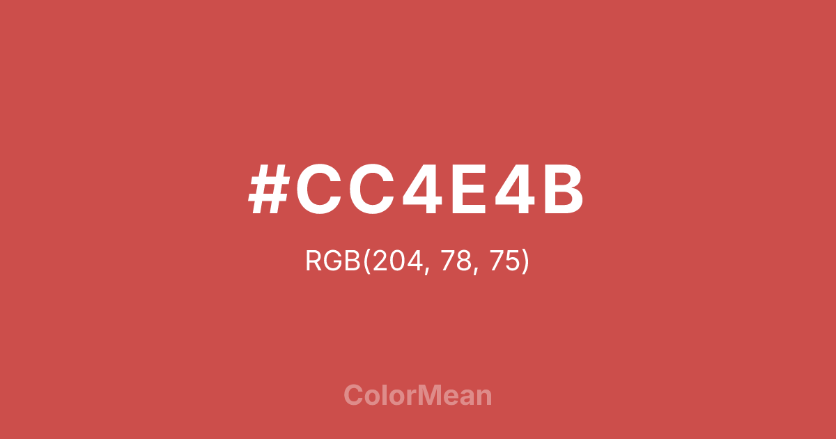 #CC4E4B RGB value is (204, 78, 75). The hex color red value is 204, green is 78, and blue is 75. Its HSL format shows a hue of 1°, saturation of 56 percent, and lightness of 55 percent. The CMYK process values are 0 percent, 62 percent, 63 percent, 20 percent.