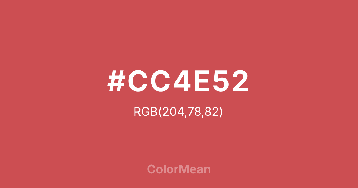 #CC4E52 RGB value is (204, 78, 82). The hex color red value is 204, green is 78, and blue is 82. Its HSL format shows a hue of 358°, saturation of 55 percent, and lightness of 55 percent. The CMYK process values are 0 percent, 62 percent, 60 percent, 20 percent.