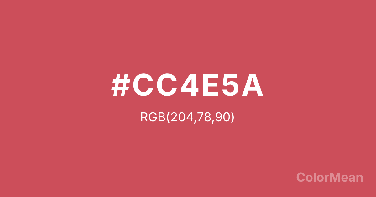 #CC4E5A RGB value is (204, 78, 90). The hex color red value is 204, green is 78, and blue is 90. Its HSL format shows a hue of 354°, saturation of 55 percent, and lightness of 55 percent. The CMYK process values are 0 percent, 62 percent, 56 percent, 20 percent.