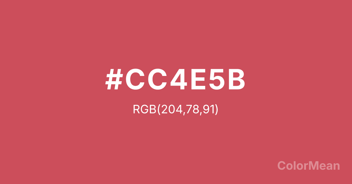 #CC4E5B RGB value is (204, 78, 91). The hex color red value is 204, green is 78, and blue is 91. Its HSL format shows a hue of 354°, saturation of 55 percent, and lightness of 55 percent. The CMYK process values are 0 percent, 62 percent, 55 percent, 20 percent.