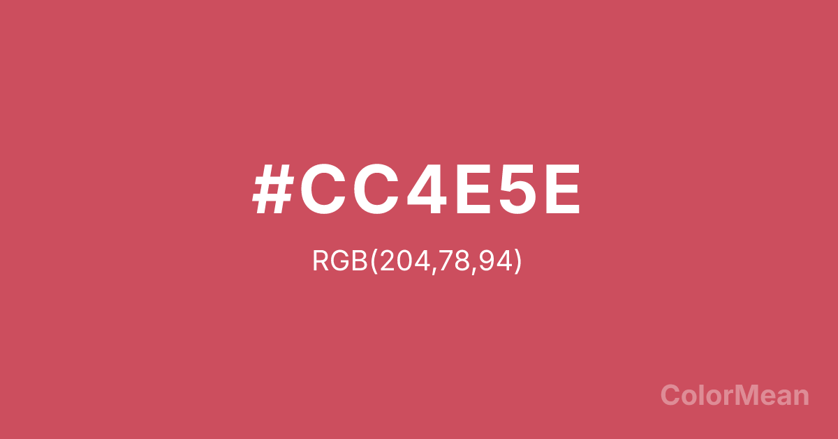#CC4E5E RGB value is (204, 78, 94). The hex color red value is 204, green is 78, and blue is 94. Its HSL format shows a hue of 352°, saturation of 55 percent, and lightness of 55 percent. The CMYK process values are 0 percent, 62 percent, 54 percent, 20 percent.