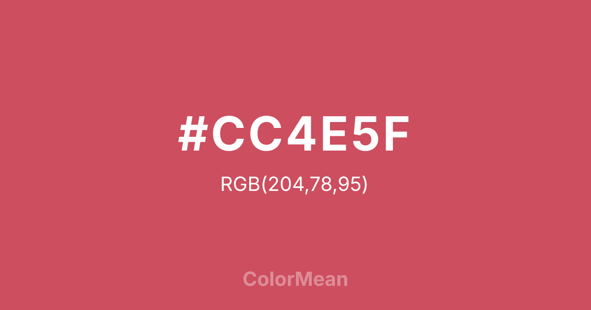 #CC4E5F RGB value is (204, 78, 95). The hex color red value is 204, green is 78, and blue is 95. Its HSL format shows a hue of 352°, saturation of 55 percent, and lightness of 55 percent. The CMYK process values are 0 percent, 62 percent, 53 percent, 20 percent.