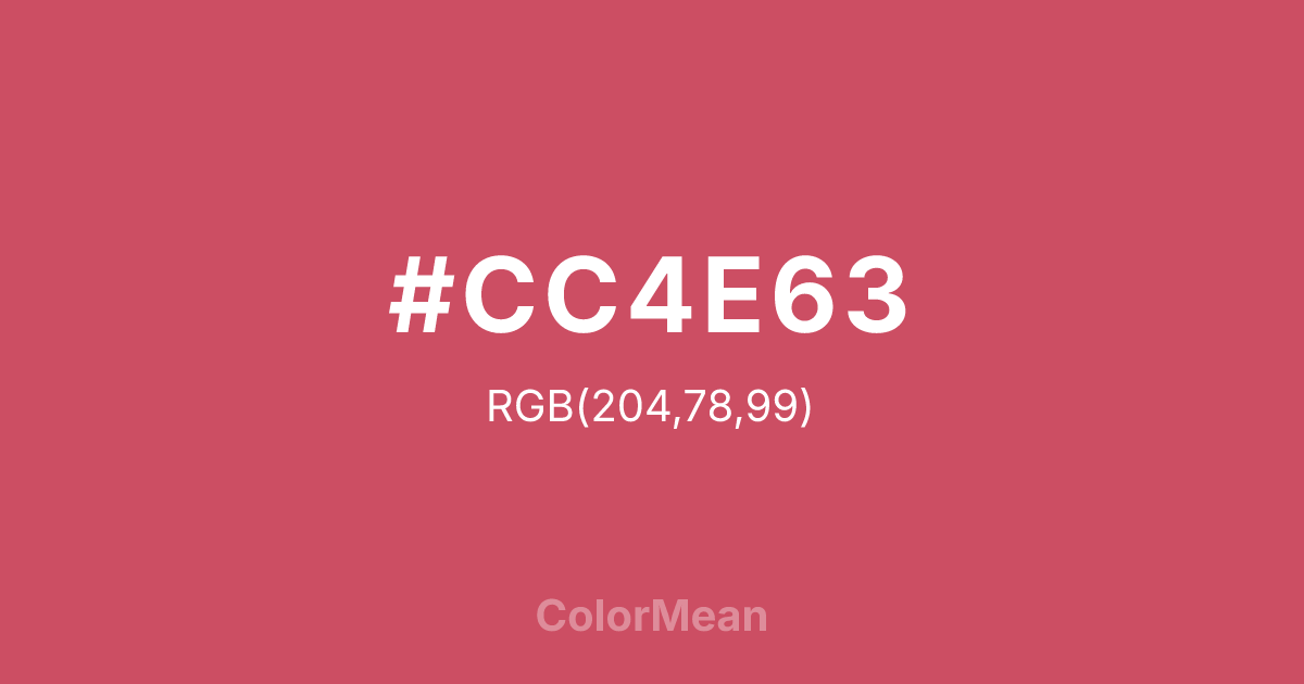 #CC4E63 RGB value is (204, 78, 99). The hex color red value is 204, green is 78, and blue is 99. Its HSL format shows a hue of 350°, saturation of 55 percent, and lightness of 55 percent. The CMYK process values are 0 percent, 62 percent, 51 percent, 20 percent.