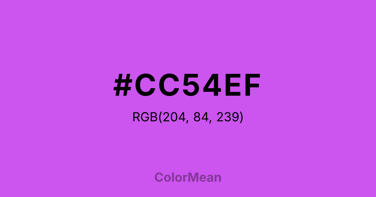 #CC54EF RGB value is (204, 84, 239). The hex color red value is 204, green is 84, and blue is 239. Its HSL format shows a hue of 286°, saturation of 83 percent, and lightness of 63 percent. The CMYK process values are 15 percent, 65 percent, 0 percent, 6 percent.