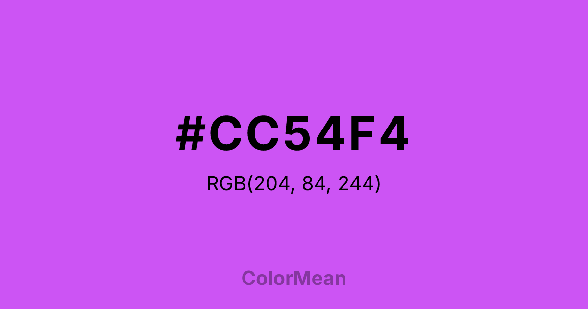 #CC54F4 RGB value is (204, 84, 244). The hex color red value is 204, green is 84, and blue is 244. Its HSL format shows a hue of 285°, saturation of 88 percent, and lightness of 64 percent. The CMYK process values are 16 percent, 66 percent, 0 percent, 4 percent.