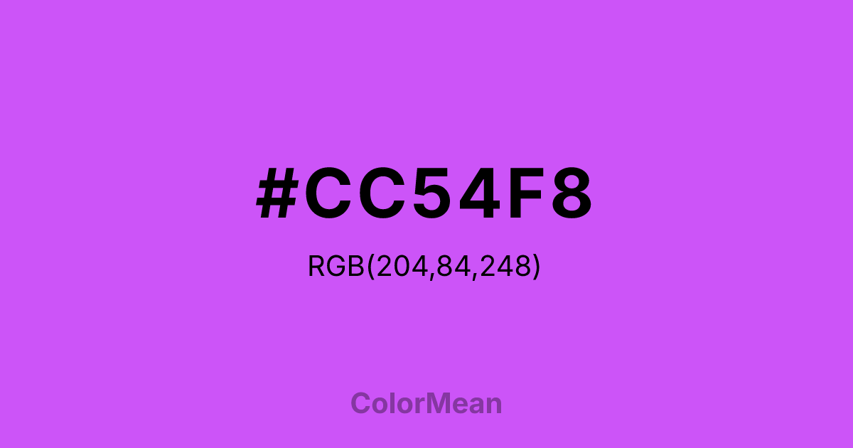 #CC54F8 RGB value is (204, 84, 248). The hex color red value is 204, green is 84, and blue is 248. Its HSL format shows a hue of 284°, saturation of 92 percent, and lightness of 65 percent. The CMYK process values are 18 percent, 66 percent, 0 percent, 3 percent.
