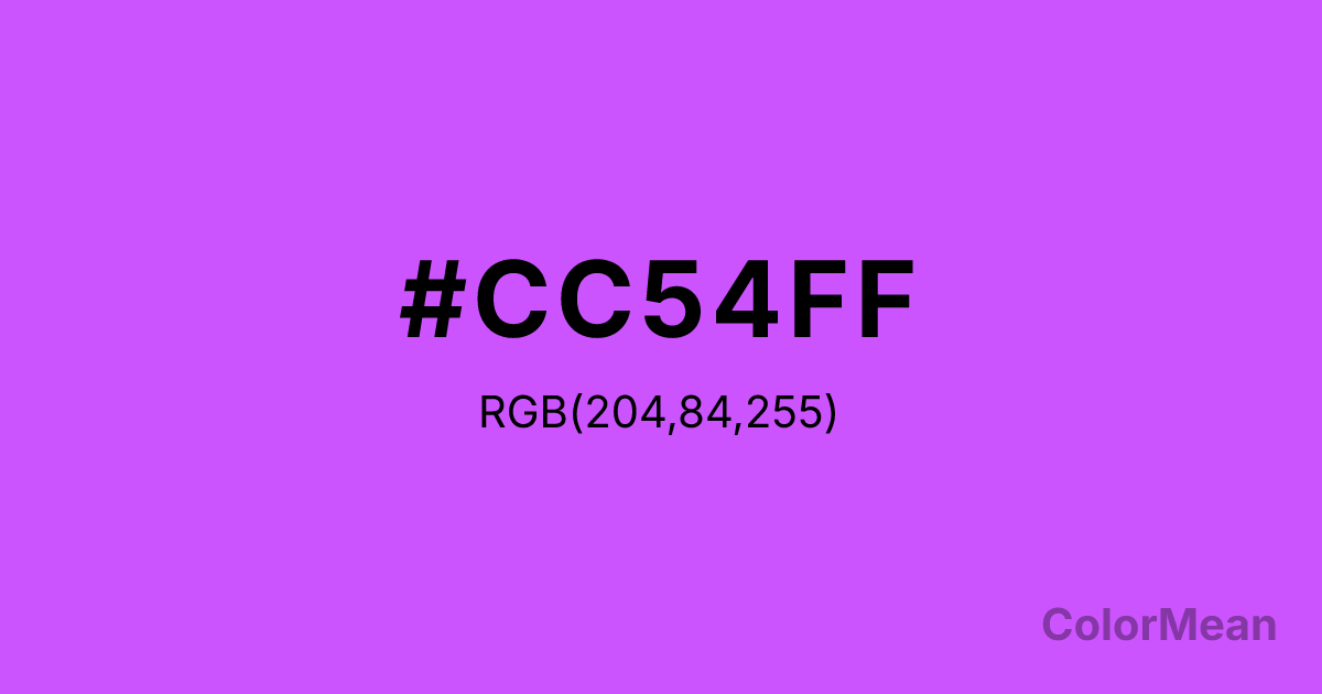 #CC54FF RGB value is (204, 84, 255). The hex color red value is 204, green is 84, and blue is 255. Its HSL format shows a hue of 282°, saturation of 100 percent, and lightness of 66 percent. The CMYK process values are 20 percent, 67 percent, 0 percent, 0 percent.