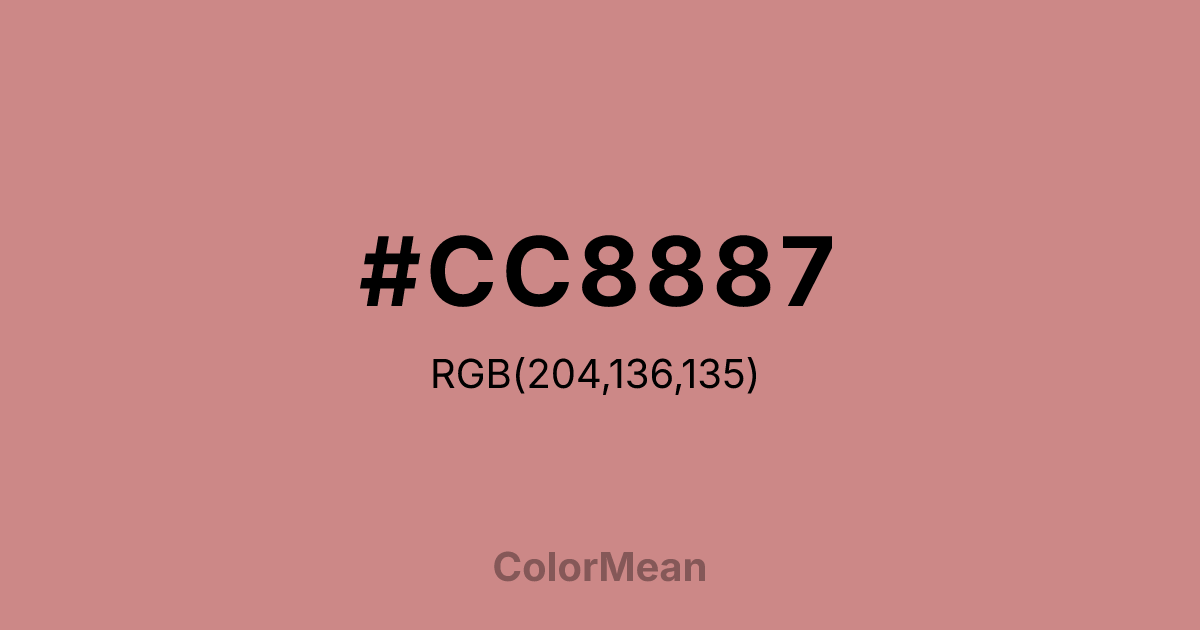 #CC8887 RGB value is (204, 136, 135). The hex color red value is 204, green is 136, and blue is 135. Its HSL format shows a hue of 1°, saturation of 40 percent, and lightness of 66 percent. The CMYK process values are 0 percent, 33 percent, 34 percent, 20 percent.