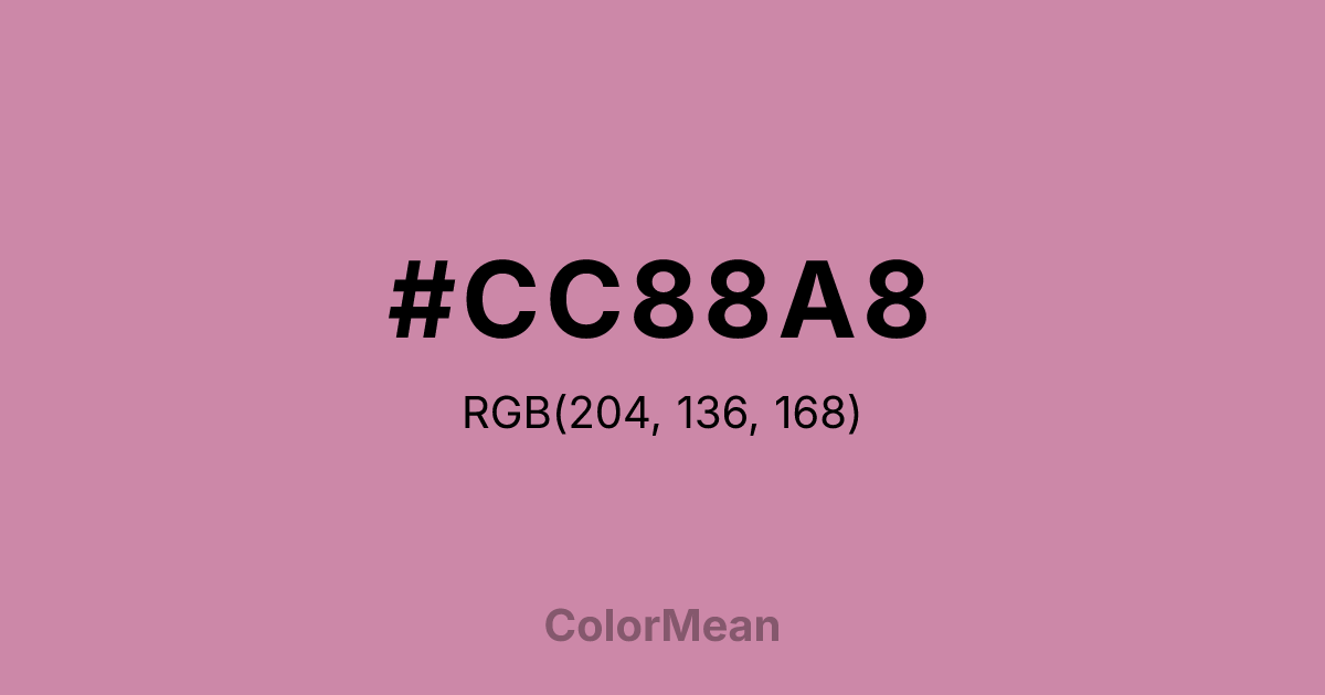 #CC88A8 RGB value is (204, 136, 168). The hex color red value is 204, green is 136, and blue is 168. Its HSL format shows a hue of 332°, saturation of 40 percent, and lightness of 67 percent. The CMYK process values are 0 percent, 33 percent, 18 percent, 20 percent.