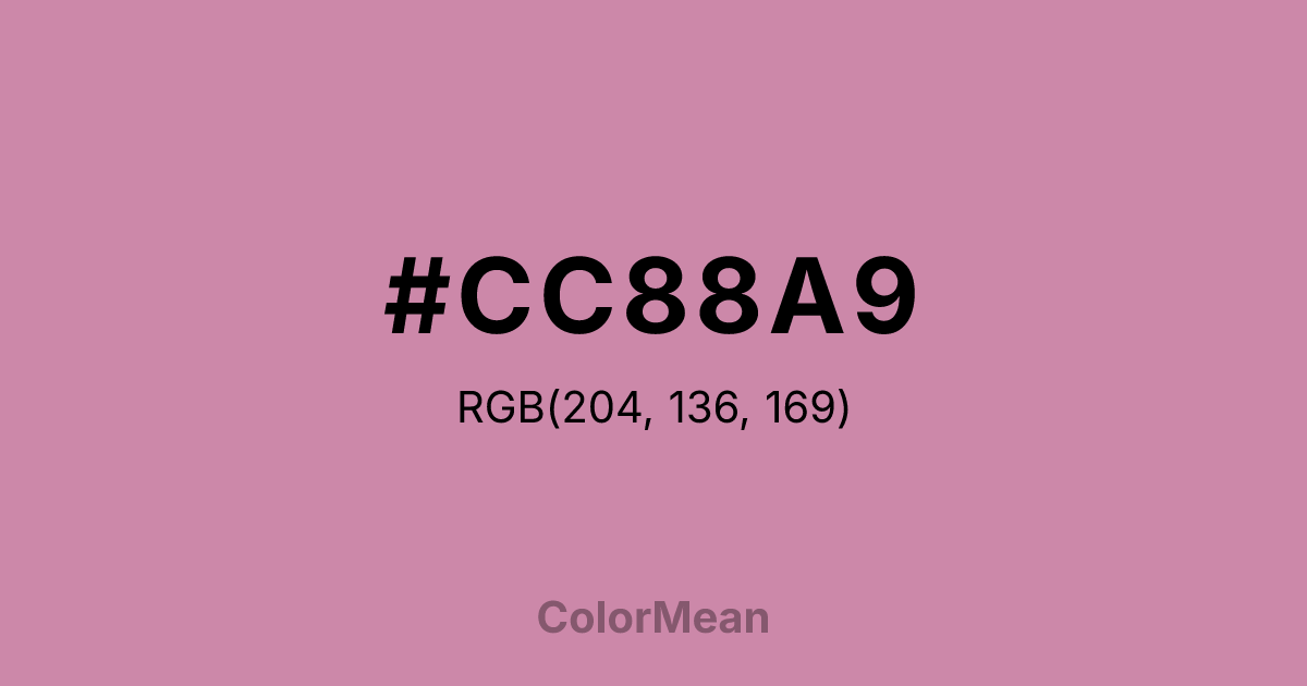 #CC88A9 RGB value is (204, 136, 169). The hex color red value is 204, green is 136, and blue is 169. Its HSL format shows a hue of 331°, saturation of 40 percent, and lightness of 67 percent. The CMYK process values are 0 percent, 33 percent, 17 percent, 20 percent.