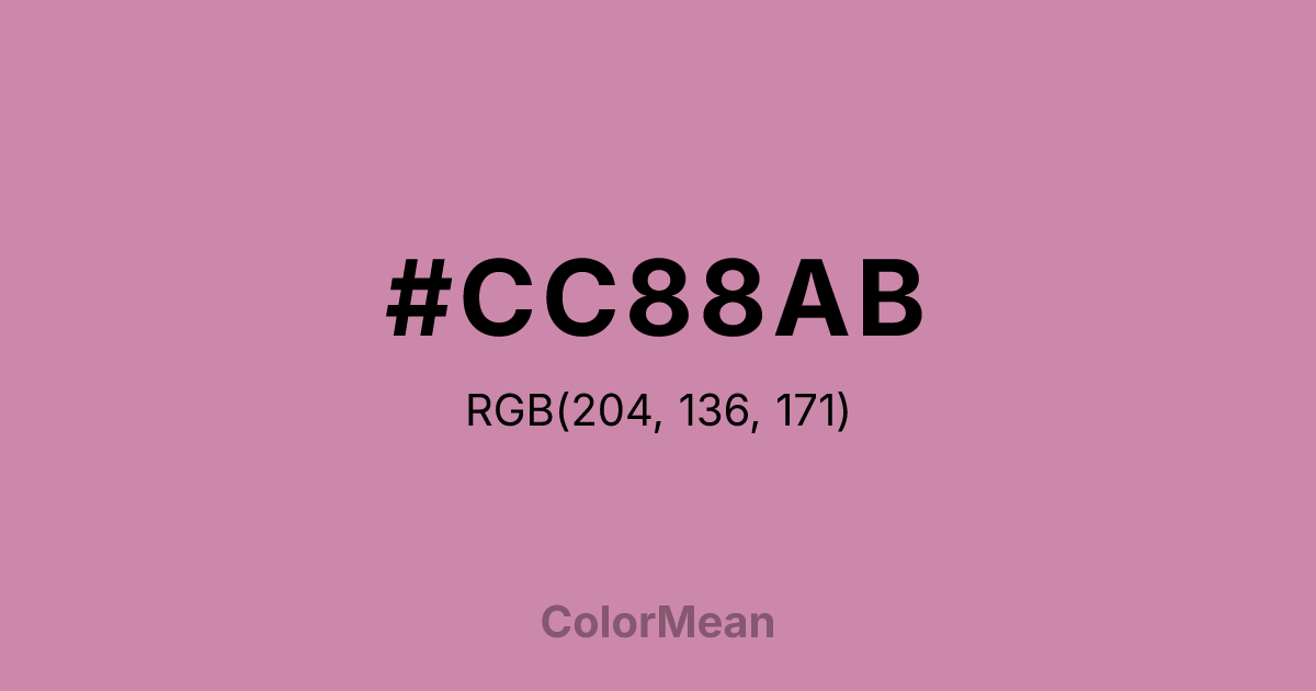 #CC88AB RGB value is (204, 136, 171). The hex color red value is 204, green is 136, and blue is 171. Its HSL format shows a hue of 329°, saturation of 40 percent, and lightness of 67 percent. The CMYK process values are 0 percent, 33 percent, 16 percent, 20 percent.