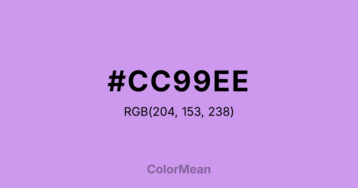 #CC99EE RGB value is (204, 153, 238). The hex color red value is 204, green is 153, and blue is 238. Its HSL format shows a hue of 276°, saturation of 71 percent, and lightness of 77 percent. The CMYK process values are 14 percent, 36 percent, 0 percent, 7 percent.