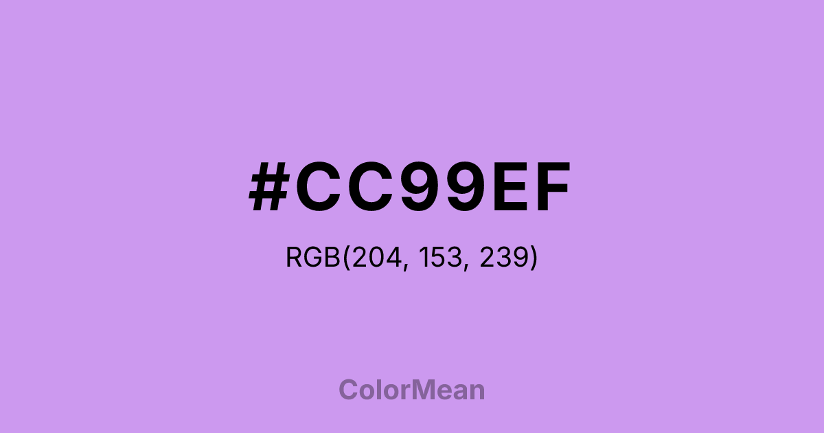 #CC99EF RGB value is (204, 153, 239). The hex color red value is 204, green is 153, and blue is 239. Its HSL format shows a hue of 276°, saturation of 73 percent, and lightness of 77 percent. The CMYK process values are 15 percent, 36 percent, 0 percent, 6 percent.