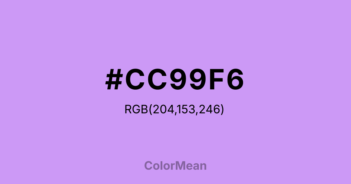 #CC99F6 RGB value is (204, 153, 246). The hex color red value is 204, green is 153, and blue is 246. Its HSL format shows a hue of 273°, saturation of 84 percent, and lightness of 78 percent. The CMYK process values are 17 percent, 38 percent, 0 percent, 4 percent.