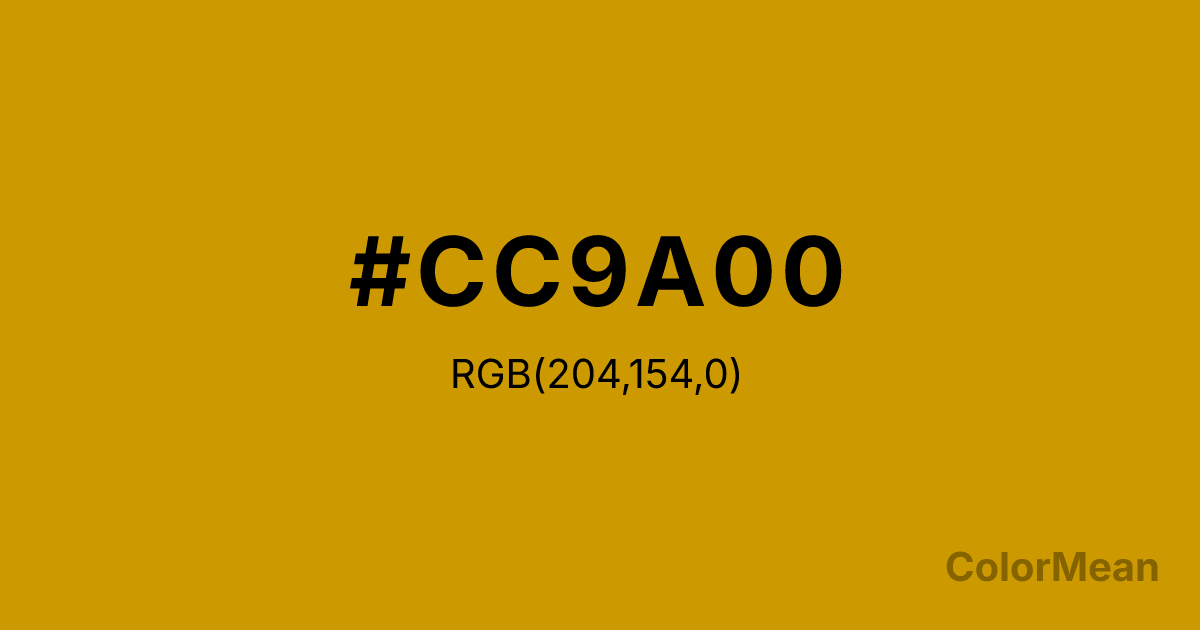 #CC9A00 RGB value is (204, 154, 0). The hex color red value is 204, green is 154, and blue is 0. Its HSL format shows a hue of 45°, saturation of 100 percent, and lightness of 40 percent. The CMYK process values are 0 percent, 25 percent, 100 percent, 20 percent.