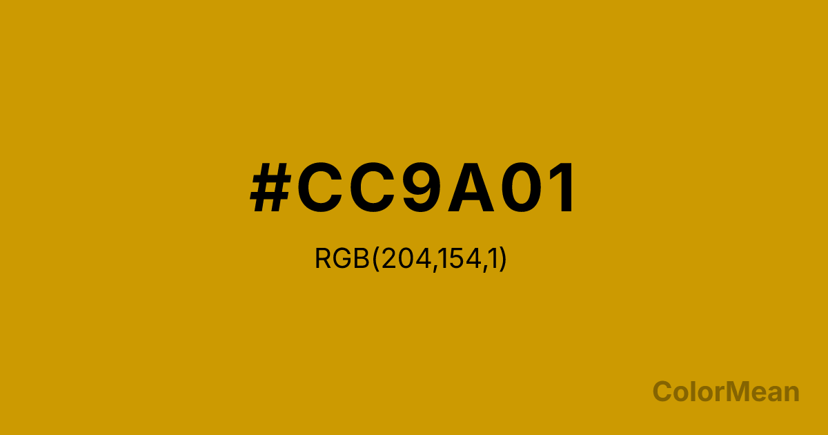 #CC9A01 RGB value is (204, 154, 1). The hex color red value is 204, green is 154, and blue is 1. Its HSL format shows a hue of 45°, saturation of 99 percent, and lightness of 40 percent. The CMYK process values are 0 percent, 25 percent, 100 percent, 20 percent.