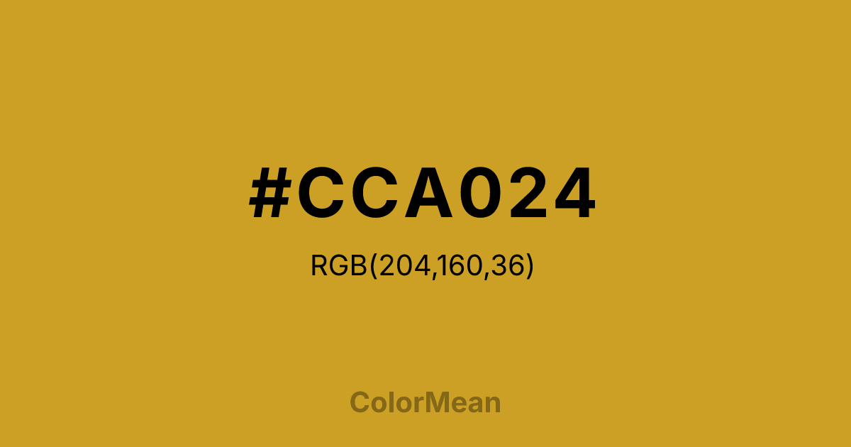 #CCA024 RGB value is (204, 160, 36). The hex color red value is 204, green is 160, and blue is 36. Its HSL format shows a hue of 44°, saturation of 70 percent, and lightness of 47 percent. The CMYK process values are 0 percent, 22 percent, 82 percent, 20 percent.