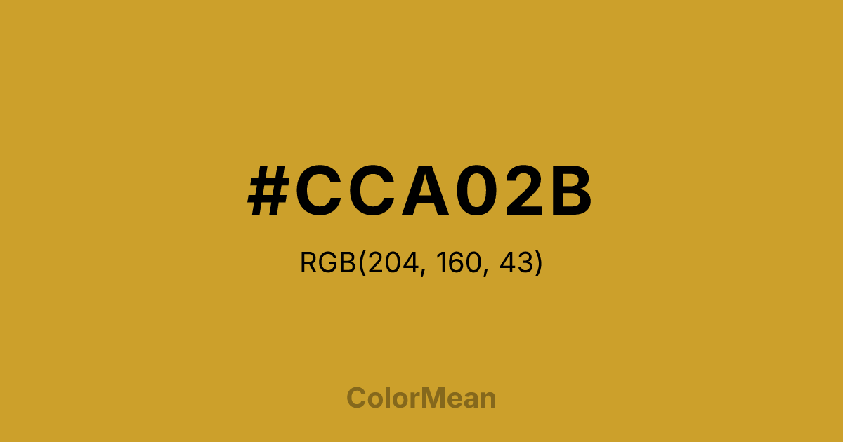 #CCA02B RGB value is (204, 160, 43). The hex color red value is 204, green is 160, and blue is 43. Its HSL format shows a hue of 44°, saturation of 65 percent, and lightness of 48 percent. The CMYK process values are 0 percent, 22 percent, 79 percent, 20 percent.