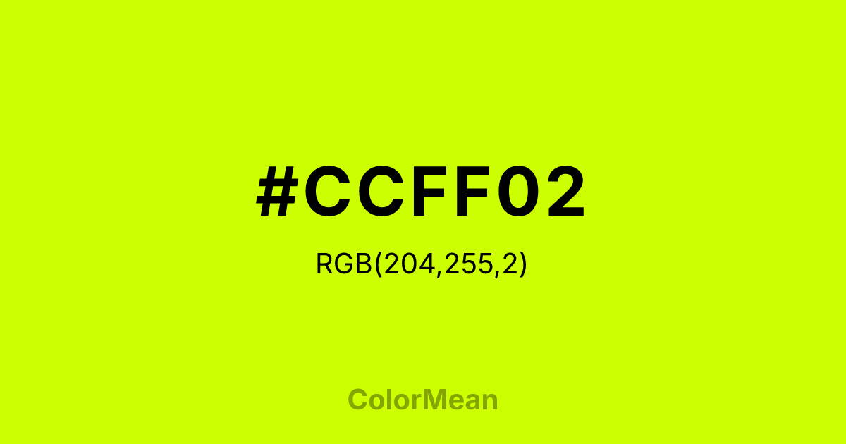 #CCFF02 RGB value is (204, 255, 2). The hex color red value is 204, green is 255, and blue is 2. Its HSL format shows a hue of 72°, saturation of 100 percent, and lightness of 50 percent. The CMYK process values are 20 percent, 0 percent, 99 percent, 0 percent.
