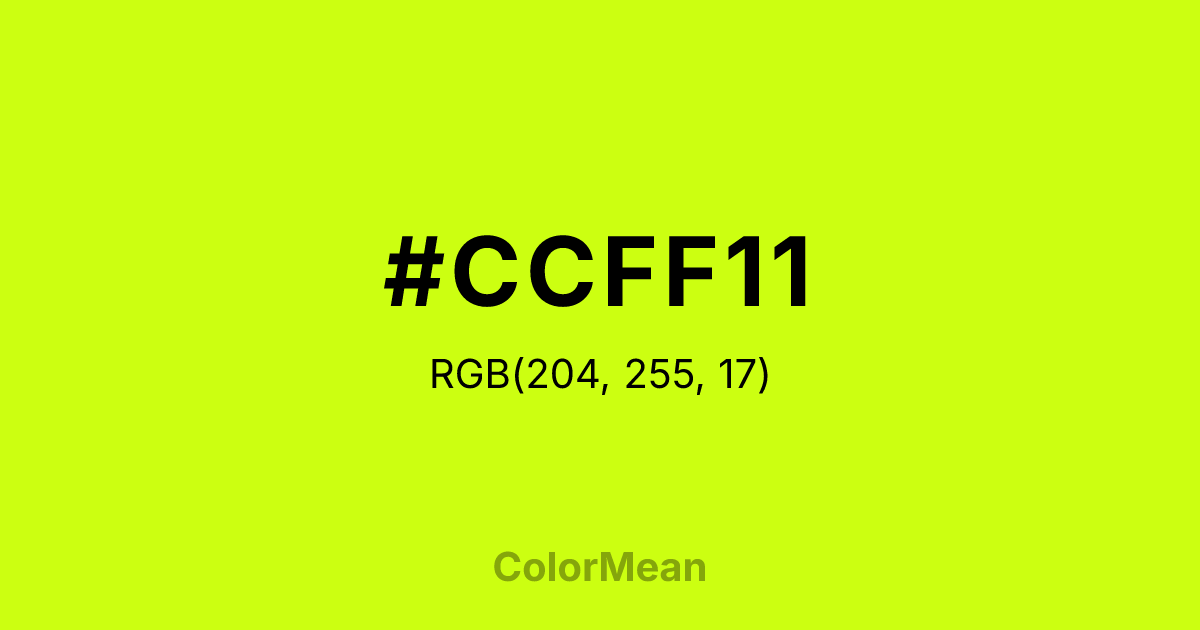 #CCFF11 RGB value is (204, 255, 17). The hex color red value is 204, green is 255, and blue is 17. Its HSL format shows a hue of 73°, saturation of 100 percent, and lightness of 53 percent. The CMYK process values are 20 percent, 0 percent, 93 percent, 0 percent.