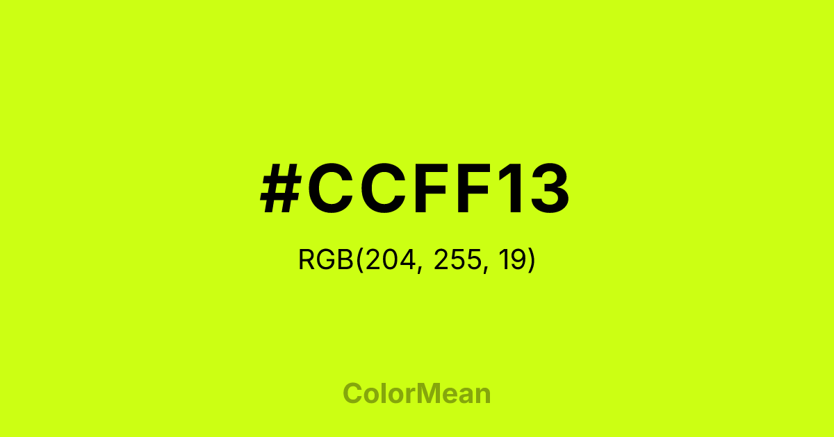 #CCFF13 RGB value is (204, 255, 19). The hex color red value is 204, green is 255, and blue is 19. Its HSL format shows a hue of 73°, saturation of 100 percent, and lightness of 54 percent. The CMYK process values are 20 percent, 0 percent, 93 percent, 0 percent.