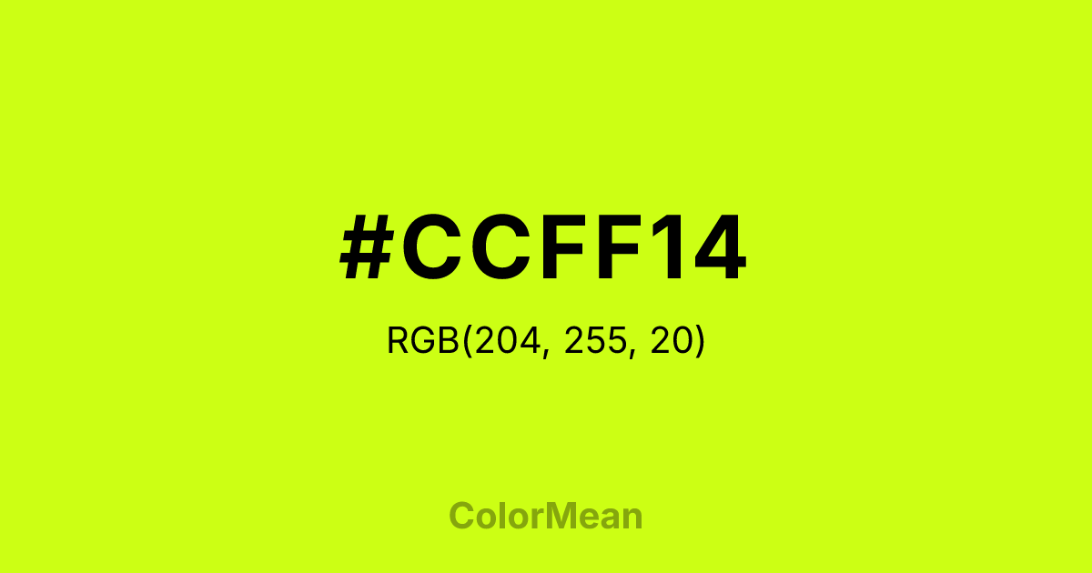 #CCFF14 RGB value is (204, 255, 20). The hex color red value is 204, green is 255, and blue is 20. Its HSL format shows a hue of 73°, saturation of 100 percent, and lightness of 54 percent. The CMYK process values are 20 percent, 0 percent, 92 percent, 0 percent.